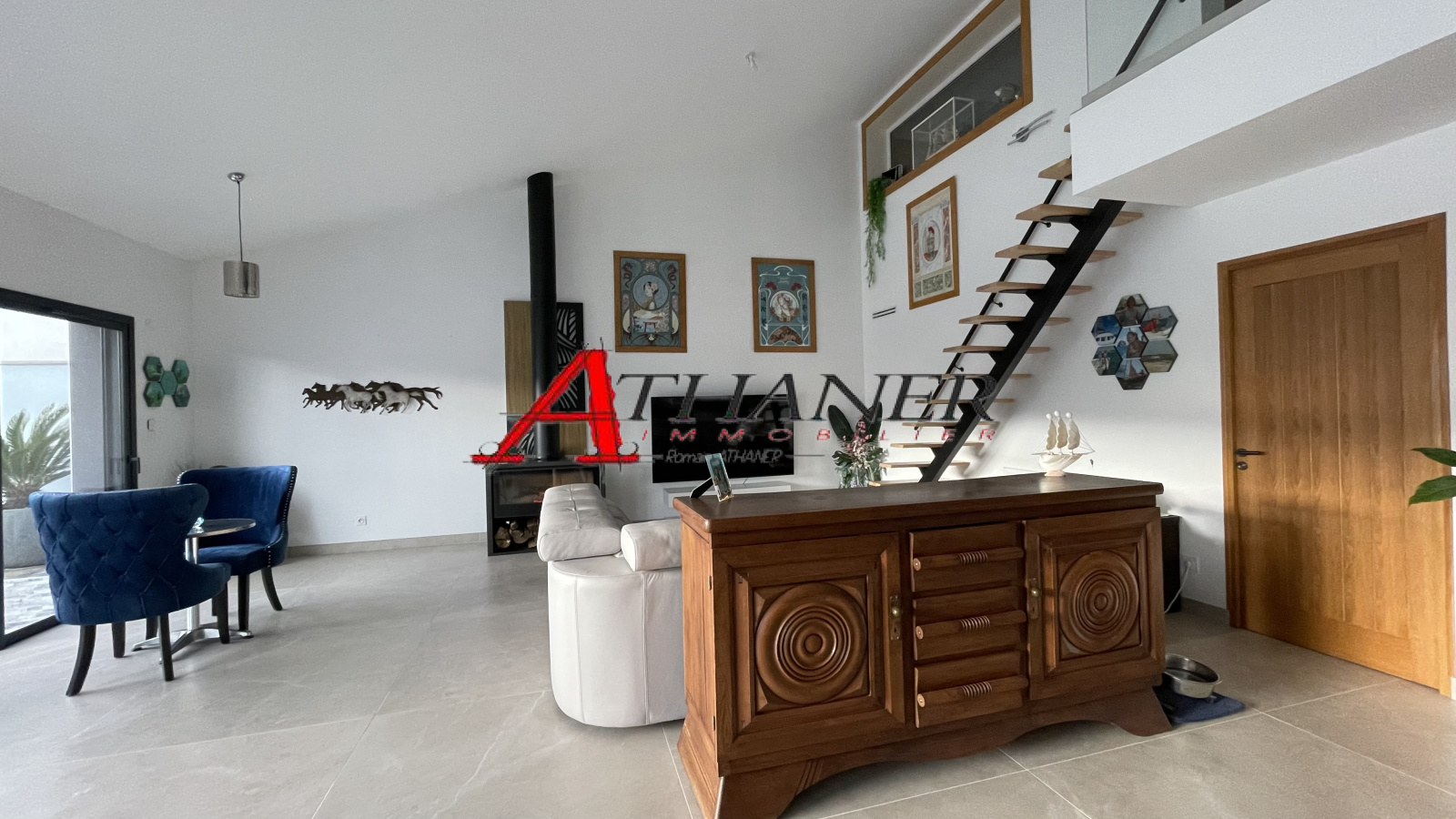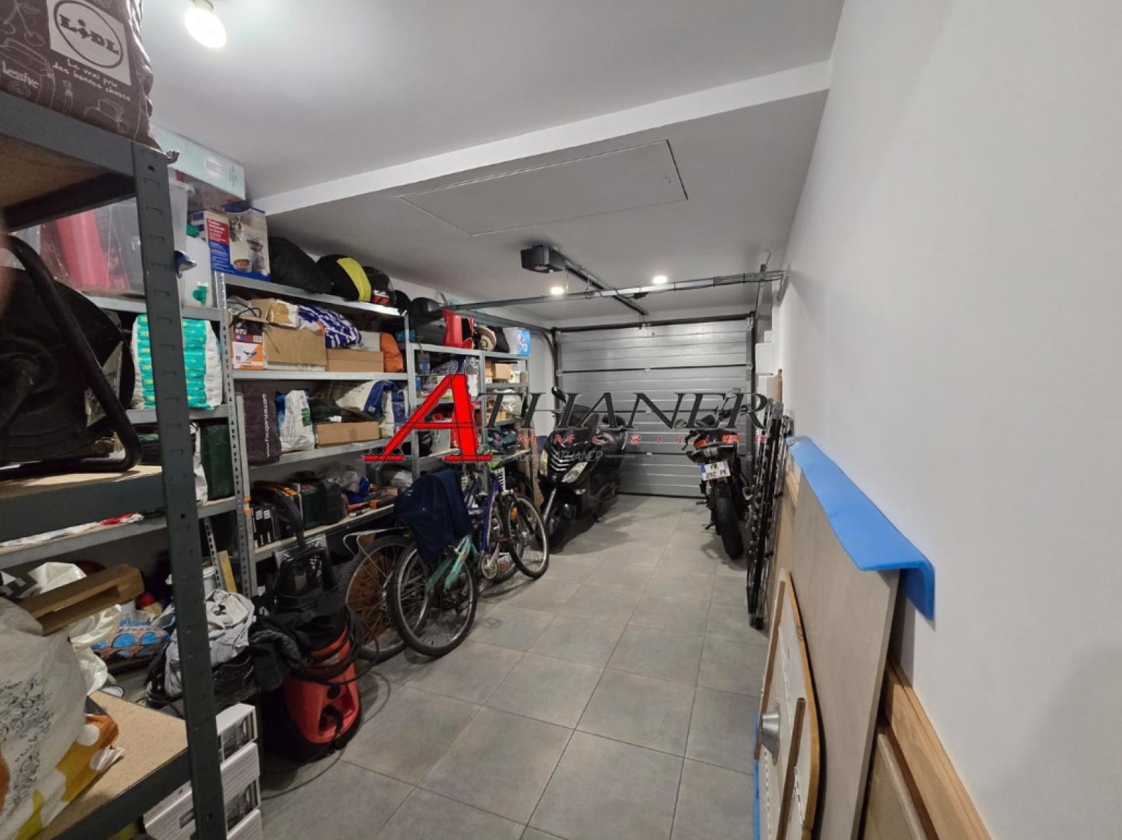 La maison dispose d'un garage avec mezzanine, d'un cellier et d'une buanderie, offrant de nombreux espaces de rangement.