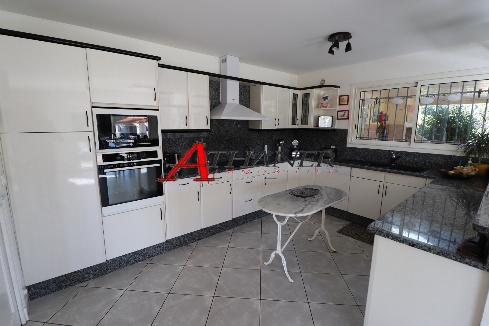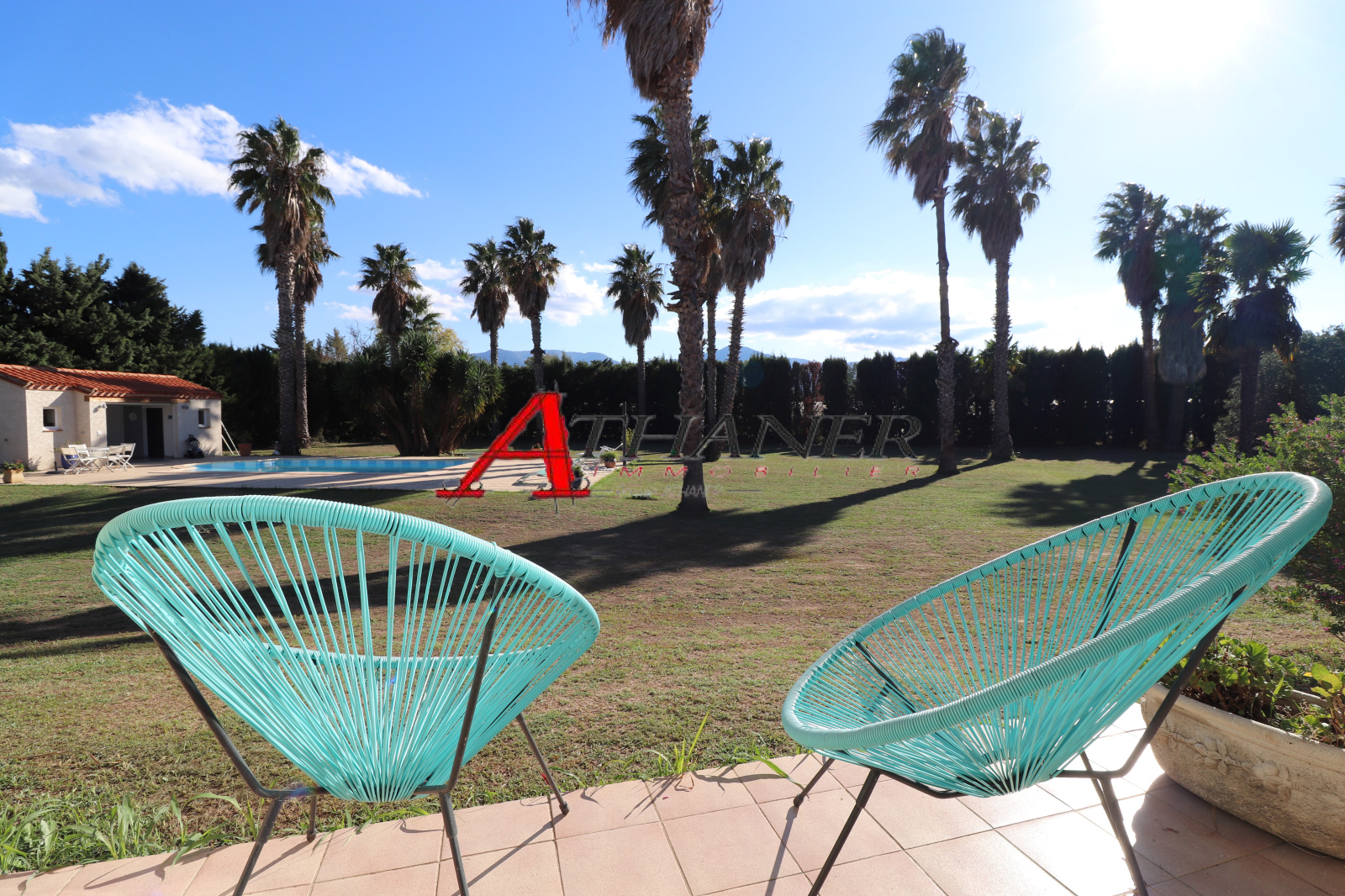 Grande terrasse couverte avec cuisine d’été attenant à la maison. Idéalement exposée, elle bénéficie d’une vue dégagée sur le massif des Albères.