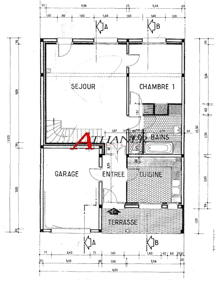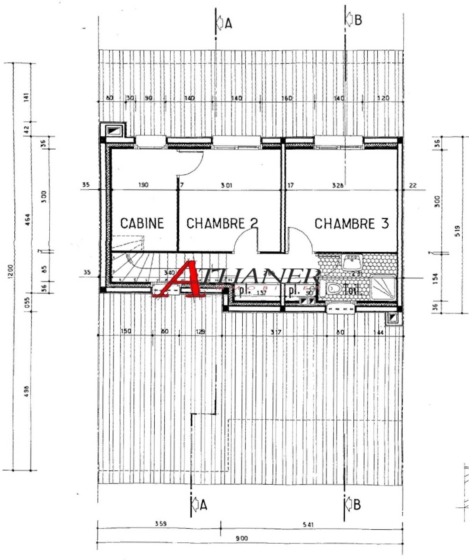 A l'étage: 3 chambres, salle d'eau avec WC.