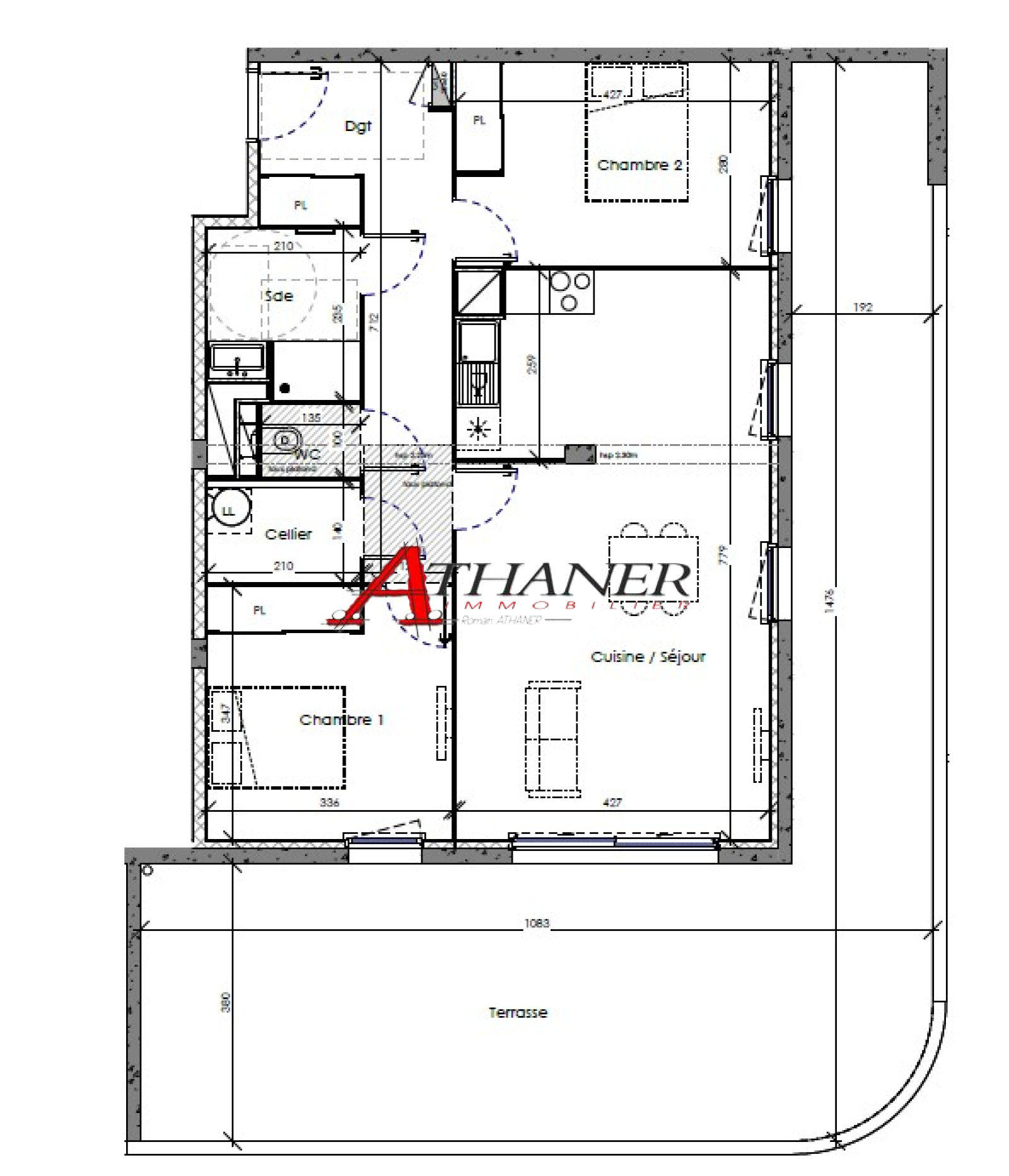 Appartement T3 : Cuisine et salle d’eau équipée, nombreux espaces de rangements, grandes ouvertures, double-exposition ... et ENFIN de grande terrasse qui prolonge la pièce de vie .